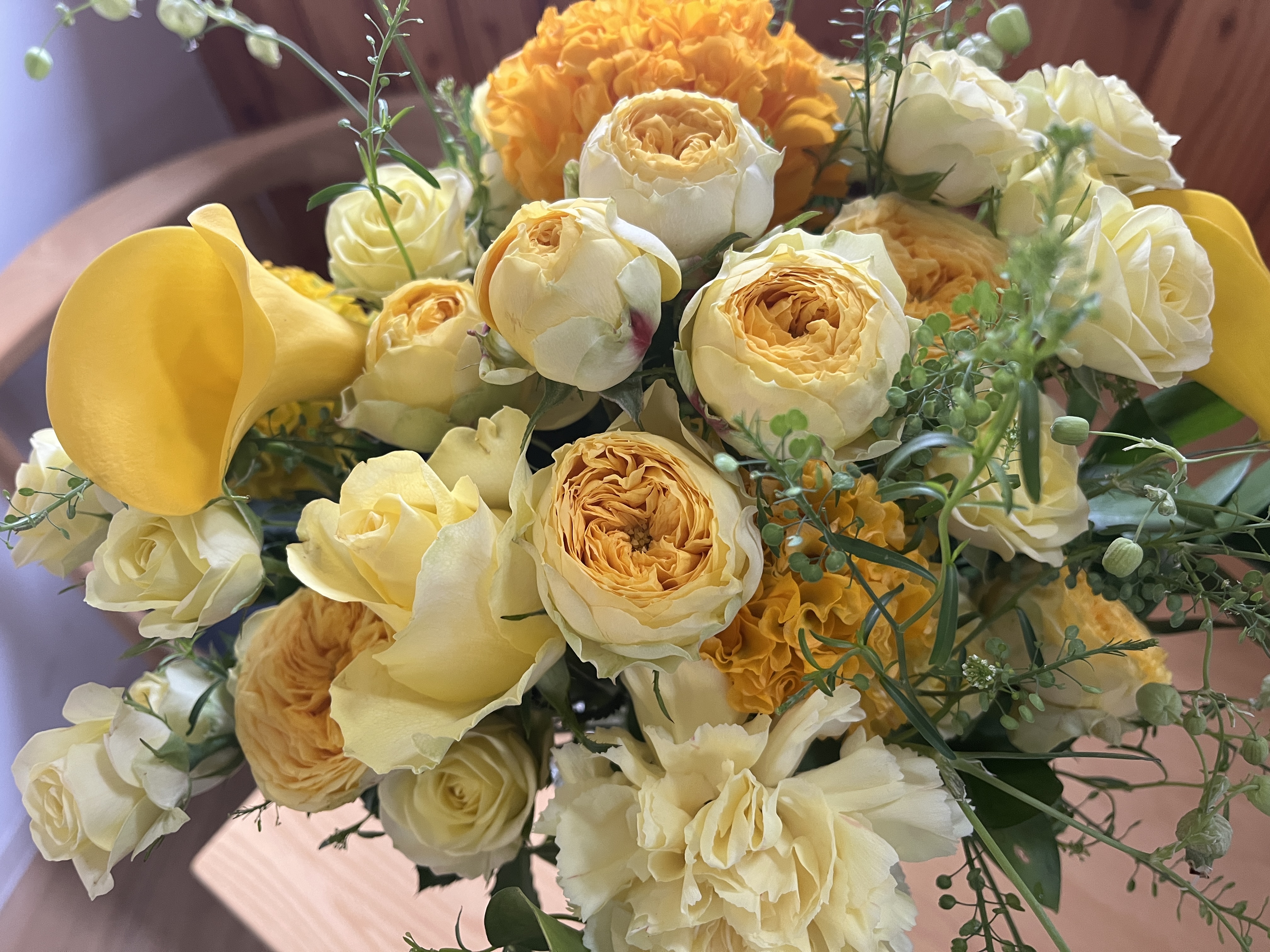 2026.04.09 もりクリニック 2026年 4月の花APRIL REBIUS-les fleurs- MASA KAWAI さんの、 2026年4月APRILの花🌸 ・薔薇(SPサニートレンドセッター) ・薔薇(SPウエディングインバイト) ・薔薇(ソラーレ) ・ラナンキュラス(ルナ) ・カーネーション(イエローパレオ) ・タラスピ ・グリーンベル ・ルスカス