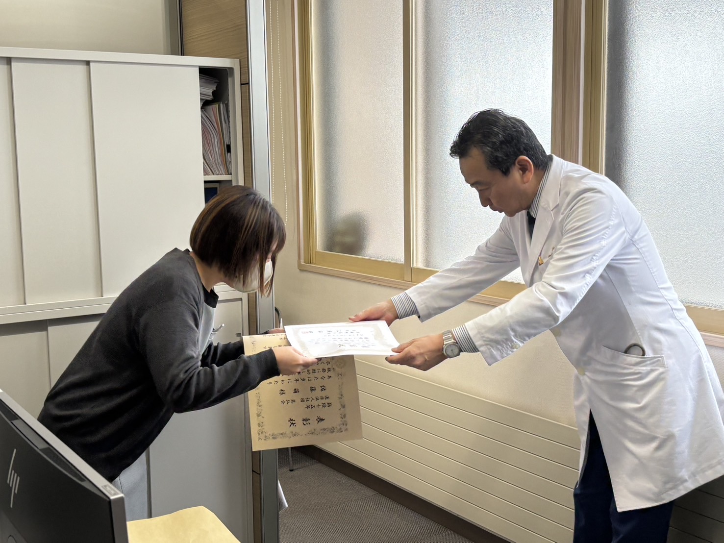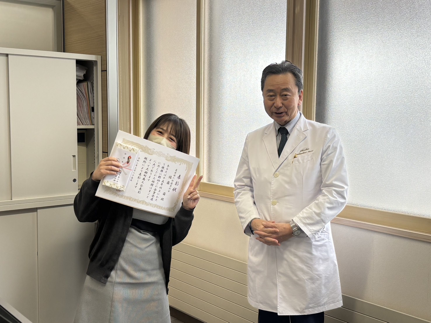 2026.03.27 森クリニック 永年勤続表彰!おめでとうございます! この度、大樹森クリニックの佐藤事務員が、永年勤続15年の表彰を、北海道商工会連合会と大樹町商工会からいただきました。 長い間のご活躍お疲れ様です。 このまま、定年まで、よろしくお願いいたします。